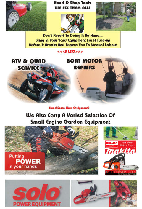 and tune-ups, hedge trimmers, lawn mowers, chain saws, weed whackers, brush cutters, garden